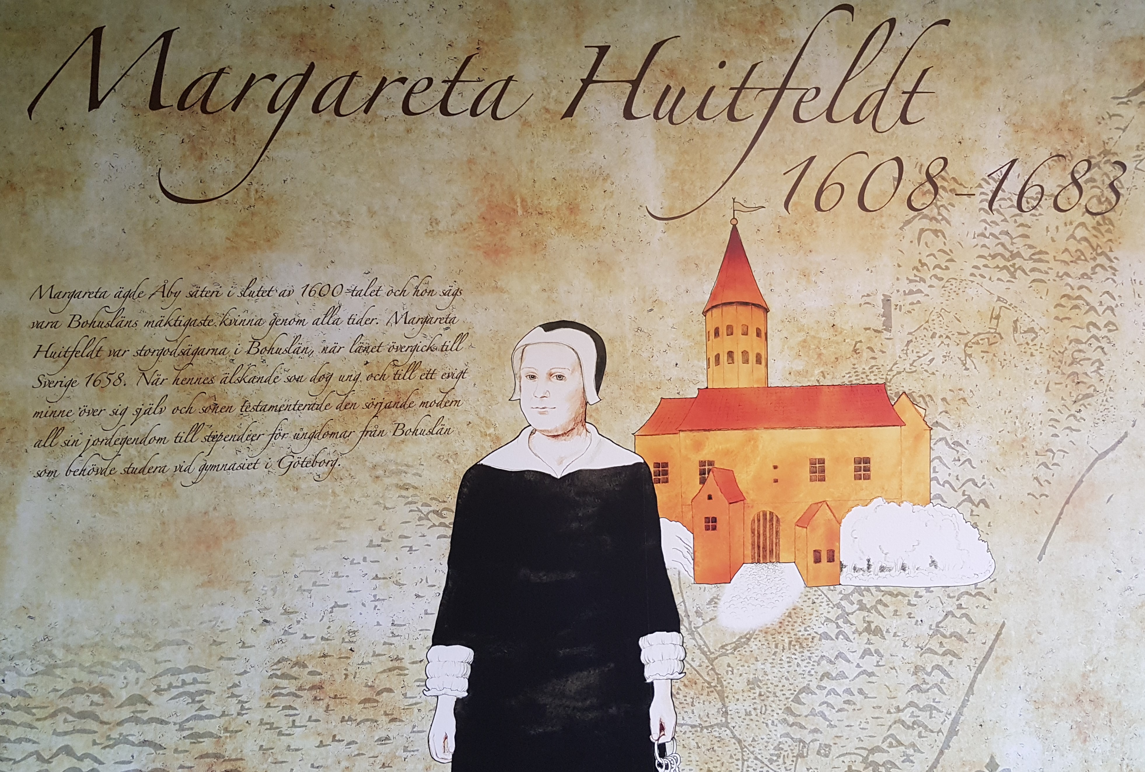 Margareta Huitfeldt är en kvinna som än idag, mer än 350 år efter sin bortgång fascinerar och sägs vara en av Bohusläns mest sägenomspunna kvinnor. Hon var på sin tid en av de allra rikaste i Bohuslän. Margareta var änka till den danske adelsmannen Tomas Dyre, och tillhörde den bohuslänska högadeln när hon 1661 köpte Åby och därmed blev en av de största jordägarna i Bohuslän. Säteriet omfattades då av huvudgården (dagens Mangård) samt ett tjugotal underlydande jordbruk i Tossene socken. Det var inte bara dessa gårdar Margareta förvaltade, hon hade gårdar på större delen av Tjörn och ner till strögods på Hisingen och norra Halland. Det sägs att hon förvaltade sina gårdar ”med klokhet, sparsamhet och minutiös noggrannhet”. Margareta var bosatt på sin gård på Tjörn, Sundsby säteri, det var där hon trivdes bäst och nästan alla hennes efterlämnade brev är daterade där. Margareta vistades periodvis på Åby säteri och enligt sägen hade Margareta en egen kyrkbänk i Tossene gamla kyrka.