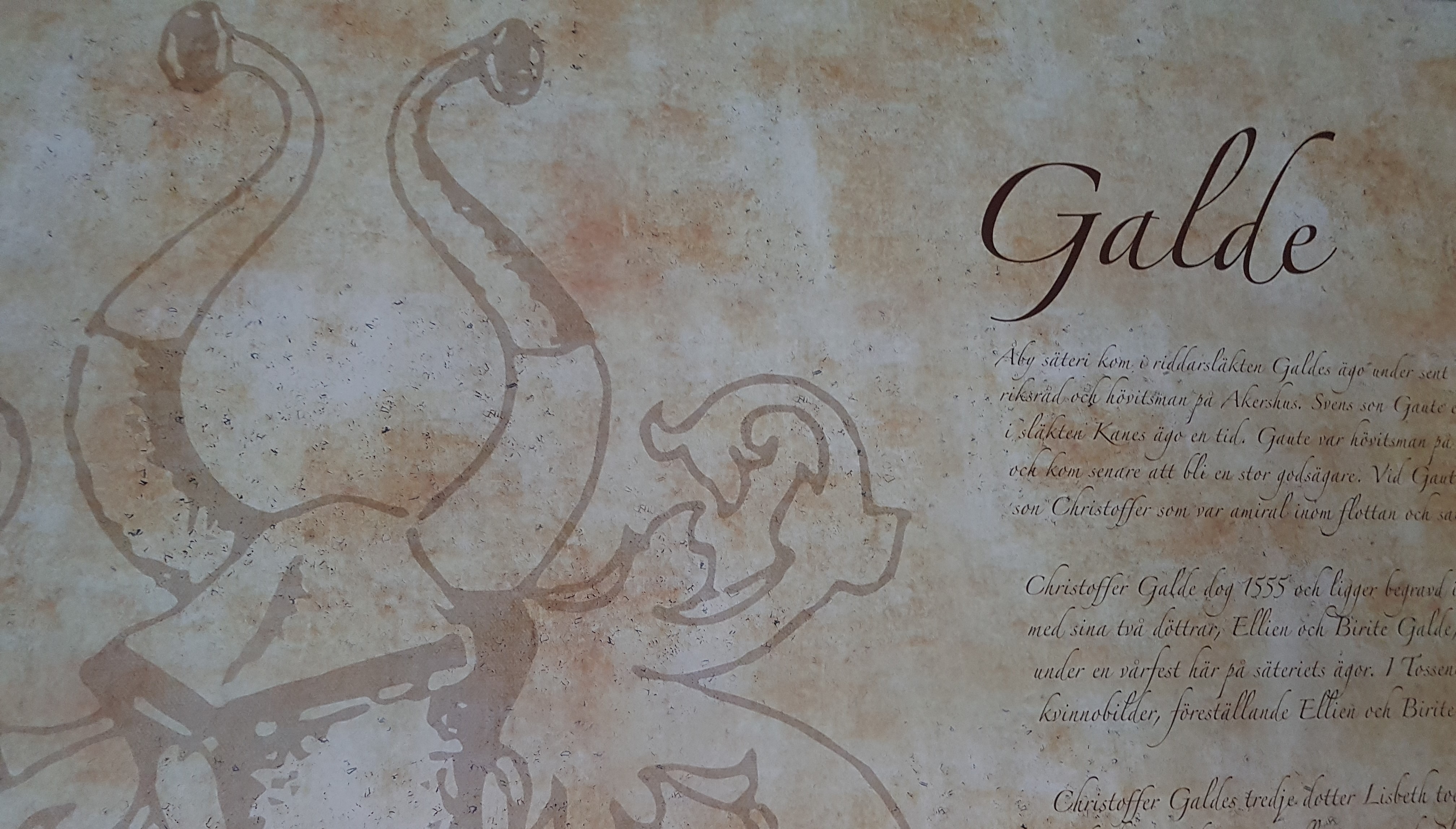 Åby säteri hamnade under 1400-talets slut i släkten Galdes ägo. Sven Galde var den förste i släkten att äga säteriet. Sven var riksråd och hövitsman på Akershus, i Norge. Sonen Gaute tog sedan över efter att gården en tid varit i släkten Kanes ägo. Gaute hade, som sin far, varit befälhavare på Bohus fästning under början av 1500-talet och kom sedan att bli en stor godsägare. Som riksråd deltog Gaute i stridigheterna om kungamakten på 1530-talet. Vid hans död 1553 gick gården i arv till hans son Christoffer som var amiral i flottan och satt som kunglig ämbetsman på Lyckå slott. Christoffer hade tre döttrar tillsammans med sin fru Birgitte Bilde. Döttrarna hette Lisbeth, Ellen och Birgitta. Ellen och Birgitta sägs ha dansat sig till döds vid en fest på säteriets ägor och i Tossene kyrka kan man idag betrakta en runsten i vapenhuset med två kvinnobilder, det galdeska och bildeska vapnet samt inskriften: