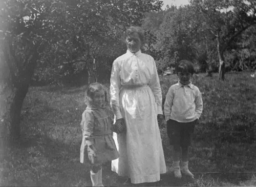 Från fruktträdgården på Åby säteri – en kvinna och två barn, tidigt 1900-tal.
