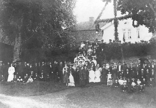 Så här såg det ut på Åby säteri vid midsommar år 1906, enligt poststämpeln på baksidan av originalfotot. På midsommarafton bjöds torpare, anställda och vänner in till fest på gården. Firandet kallades för midsommarlek och var en av årets stora högtider. Barnen dansade ringlekar kring den lövade midsommarstången, medan de vuxna dansade på gårdsplanen så länge det var ljust. När kvällen mörknade fortsatte dansen på den så kallade kålvinden, en vindsvåning i en av flyglarna som användes just för festligheter.