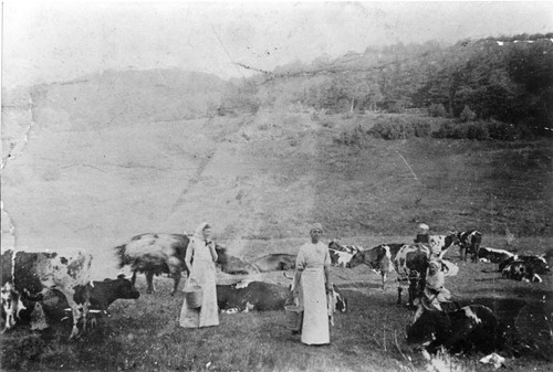 Det här fotografiet visar mjölkning på Storavall i början av 1900-talet. På den tiden var arbetet helt manuellt – korna mjölkades för hand ute på vallen sommartid. På ett stort säteri som Åby var mjölken en av de viktigaste produkterna från jordbruket. Mjölkningen gjordes både morgon och kväll, ofta av pigor och arbetare på gården. Efter mjölkningen bars mjölken direkt till mejeriet, där den togs om hand av mejerskan. Under slutet av 1800-talet arbetade här bland annat Malvina Larsson, som ansvarade för mjölkhanteringen. Tack vare hennes anteckningar har vi idag en värdefull inblick i livet på gården under den tid hon var verksam här.