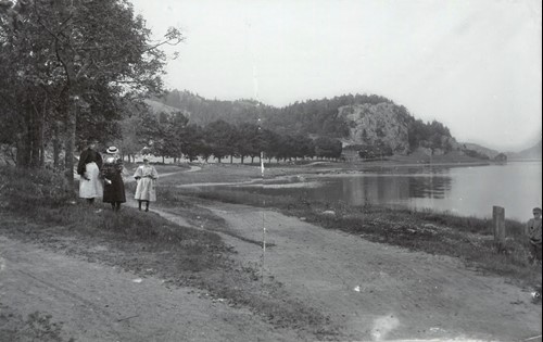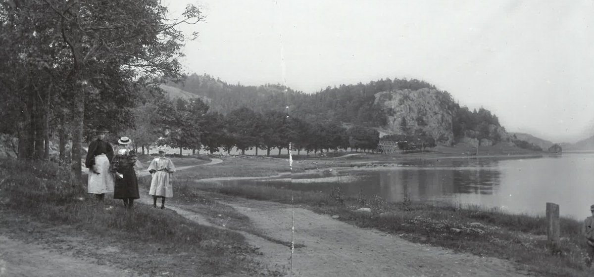 På bilden syns tre personer som promenerar längs den gamla infartsvägen till Åby säteri, alldeles vid strandkanten av Åbyfjorden. Vägen följde fjorden och användes både i vardagen och vid transporter till och från gården.