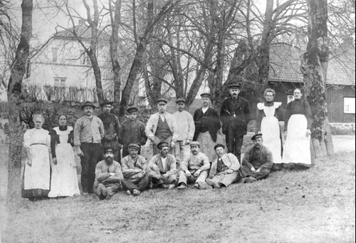 Fotografiet visar tjänstefolk samlade på gräsmattan mellan Kornboden och Mangården på Åby säteri omkring sekelskiftet 1900. Kvinnor, män och barn står tillsammans. Människor som levde och arbetade på gården och som var en självklar del av livet på säteriet. Klädseln är enkel och praktisk, typisk för pigor, drängar och deras familjer.