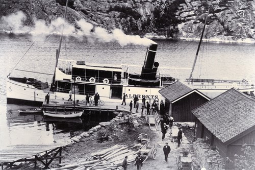 Det här fotografiet visar Åby ångbåtsbrygga, en gång en viktig knutpunkt för både människor och varor. Vid bryggan ligger ångaren Albrektsund, ett av de fartyg som trafikerade kusten under tidigt 1900-tal. Längst ut på udden syns huset där ångbåtskommissionären bodde. Hans uppgift var att ta emot båten, lasta och lossa gods, samt se till att allt fraktgods kom rätt – ett betydelsefullt ansvar i en tid då sjövägen var den snabbaste förbindelsen mellan samhällena längs kusten.